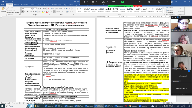 Враховуючи основні концептуальні підходи до формування та удосконалення освітніх програм підготовки магістрів, а також за результатами проведеного Всеукраїнського освітнього нетворкінгу «Практико-орієнтована підготовка фахівців з галузі 24 «Сфера обслуговування»: реалії та виклики», 16 листопада 2023 року в режимі zoom-конференції відбулася робоча нарада проектної групи забезпечення ОП «Готельно-ресторанний бізнес» другого (магістерського) рівня вищої освіти. До обговорення проекту освітньої програми на 2024/2025 н.р. були залучені науково-педагогічні працівники, які забезпечують викладання дисциплін на даній програмі.