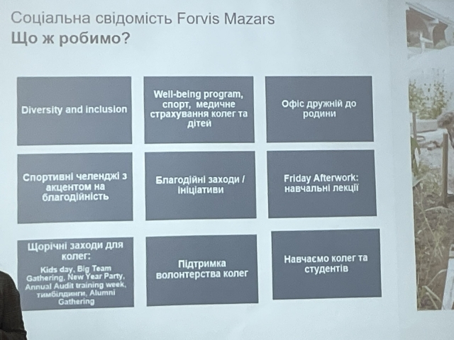 04 жовтня 2024 р. в Національному університеті біоресурсів і природокористування України представники компанії FORVIS MAZARS, для студентів 2 та 3 курсів всіх спеціальностей економічного факультету, розповіли власний досвід запровадження принципів Корпоративної соціальної відповідальності та познайомили з реальними кейсами такої роботи та їхньої важливості.