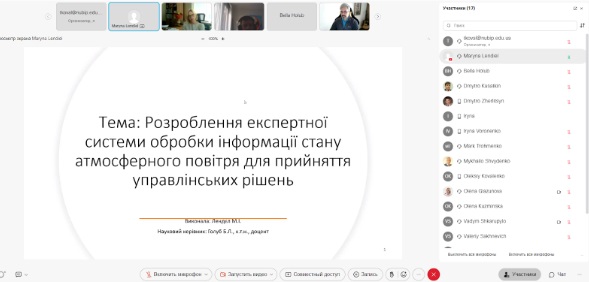 • «Розроблення експертної системи обробки інформації стану атмосферного повітря для прийняття управлінських рішень», Лендєл Марина Іванівна (науковий керівник – канд. техн. наук, доцент кафедри комп'ютерних наук Голуб Белла Львівна).