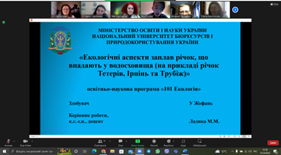 Аспірант заочної форми навчання У. Жофань науковий керівник канд. с-г. н., доцент Ладика М.М. представив дуже актуальну на сьогодні тему дисертаційної роботи «Екологічні аспекти заплав річок, що впадають у водосховища (на прикладі річок Тетерів, Ірпінь та Трубіж)»
