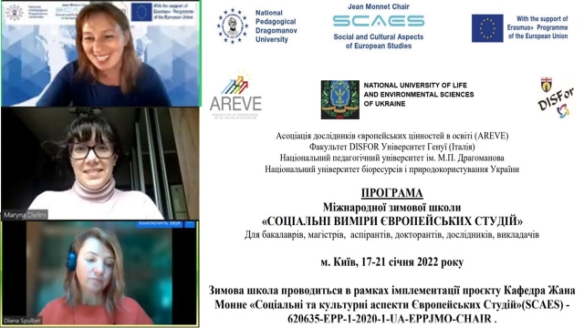 І поки студенти лише готуються до активної навчально-наукової діяльності, викладачі економічного факультету в рамках наукової співпраці з Асоціацією дослідників європейських цінностей в освіті (AREVE), Факультетом DISFOR Університету Генуї (Італія), Національним педагогічним університетом ім. М.П. Драгоманова та Факультетом аграрного менеджменту НУБіП, активно прийняли у Міжнародній зимовій школі «СОЦІАЛЬНІ ВИМІРИ ЄВРОПЕЙСЬКИХ СТУДІЙ», яка відбулась 17-22 січня 2022 року.