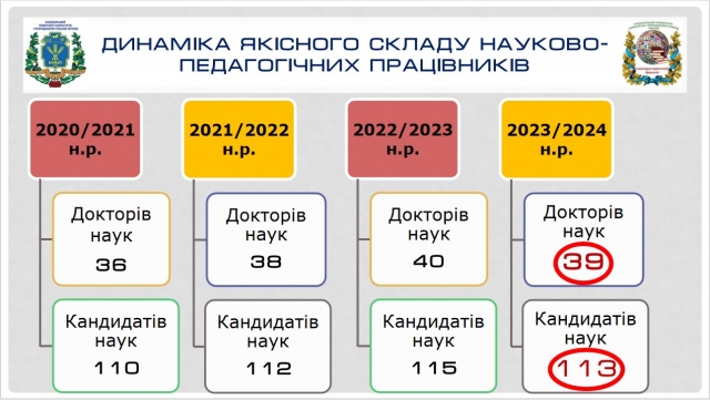 Декан зазначила позитивну динаміку якості кадрового складу кафедр. На факультеті працюють 39 докторів наук і 35 з них мають атестат професора, 113 – кандидатів наук, 76 – атестат доцентів. Протягом 2023 року відзначено було наших студентів: Ковальчук Вікторію (іменною соціальною стипендією Верховної Ради України), Ушарук Олену (іменною академічною стипендією Верховної Ради України), Комінську Марину (академічною стипендією імені Героїв Небесної Сотні).