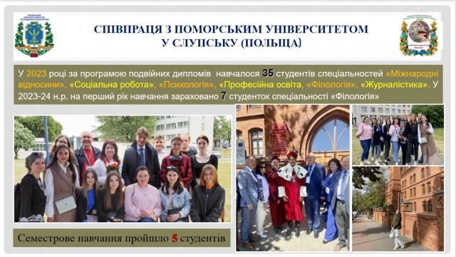 У звітному році, не зважаючи на війну, факультет розвивав співпрацю за укладеними угодами із закордонними університетами щодо стажування та навчання за програмою «подвійний диплом» в Поморському університеті в м. Слупську (Польща), продовжено роботу з Університетом Пардубіце (Чехія) за програмою Erasmus+, а також почали співпрацю з італійським Університетом Барі Альдо Моро (Італія).