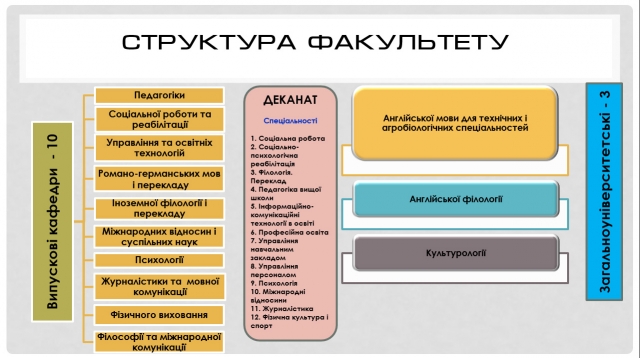 На гуманітарно-педагогічному факультеті функціонує тринадцять кафедр, з них – 3 загальноуніверситетських і 10 випускових кафедр, які продовжили роботу над розвитком спеціальностей, ліцензованих у попередні роки ‒ це сім на бакалавраті та вісім на магістратурі.