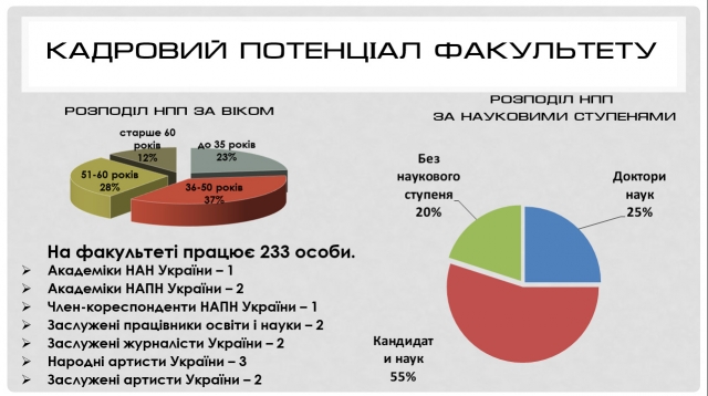 Складовою якості освіти є якість кадрового складу науково-педагогічних працівників. Освітній процес забезпечує висококваліфікований професорсько-викладацький склад: 1 академік НАН України, 2 академіки НАПН України, 1 член-кореспондент НАПН України та 7 академіків і член-кореспондентів інших громадських організацій, 2 заслужені працівники освіти і науки, 2 заслужені журналісти України, 3 народні артисти України, 2 заслужені артисти України, 31 доктор наук, професор, 3 народні артисти України, 119 кандидатів наук, доцентів, 63 старші викладачі та 21 асистент без наукового ступеня.