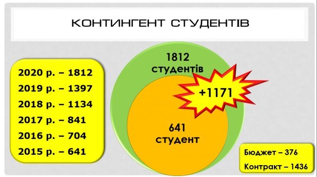 Якщо 2015 року на факультеті навчалося 641 (шістсот сорок один) студент, то на сьогодні маємо вже 1812 (тисячу вісімсот дванадцять). Тобто кількість студентів виросла більш ніж у 2,5 рази, а порівняно з 2019 роком кількість студентів збільшилася на 415 (чотириста пʼятнадцять) студентів. Це ‒ результат правильної нашої факультетської політики, оскільки вчасно ліцензували нові спеціальності.
