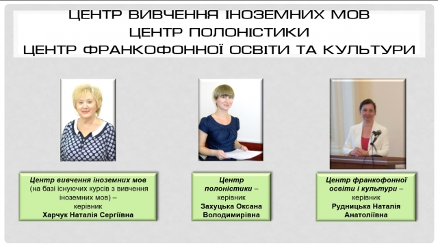 На допомогу іноземним кафедрам для вивчення та вдосконалення іноземних мов створено і функціонують три центри: «Центр вивчення іноземних мов», «Центр полоністики», «Центр франкофонної освіти і культури». Центри цьогоріч провадили свою діяльність в онлайн-режимі.