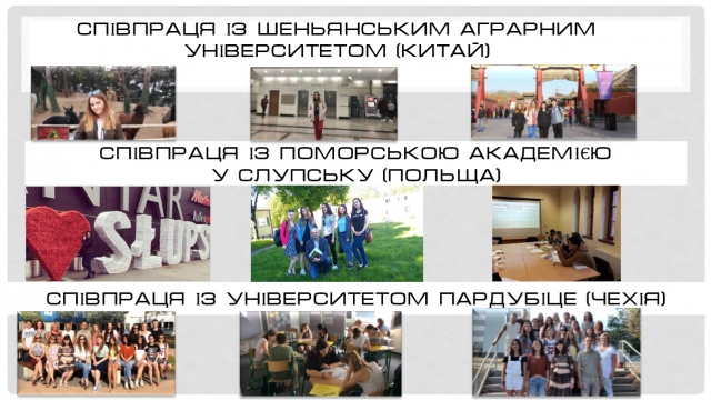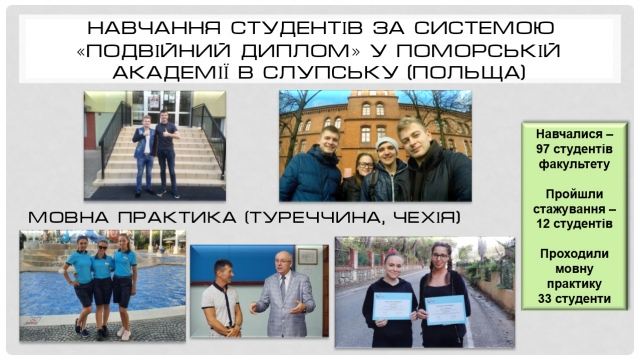 У звітному році факультет розвивав співпрацю за укладеними угодами із закордонними університетами щодо стажування та навчання за програмою «подвійний диплом» - Поморською академією в Слупську (Польща), Університетом Пардубіце (Чехія) та Шеньянським аграрним університетом (Китай). За укладеною угодою з Поморською академією в Слупську паралельно здобували освіту 97 (девʼяносто сім) студентів факультету, проходило безкоштовне стажування – 12 (дванадцять), а 33 (тридцять три) студенти проходили мовну практику в Німеччині і Туреччині, що суттєво більше проти минулого року. 2020 року факультет уклав угоду з турецькою компанією «Туї» на проходження мовної практики в Туреччині.