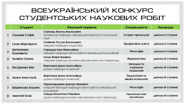У цьому році кафедри факультету посилили роботу з підготовки до всеукраїнського конкурсу студентських наукових робіт з галузей знань і спеціальностей ‒ маємо вісім призерів: друге місце на Всеукраїнському рівні завоювали Маргарита Гулян (галузь «Професійна освіта»), Софія Сальник (галузь «Історія і археологія»), Єлизавета Артемчук (галузь «Філософія»), третє місце вибороли Альона Башинська (галузь «Філософія»), Юлія Закатей (галузь «Германські мови (англійська, німецька)»), Яна Писаренко (галузь «Загальна та соціальна психологія»), Анастасія Змага (галузь «Педагогічна та вікова психологія»), Олена Льовіна (галузь «Журналістика»).