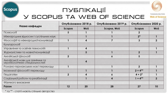 Найкращу публікаційну активність підтримують науково-педагогічні працівники кафедри педагогіки і кафедри англійської філології. Активізували свою роботу в цьому напрямі місці кафедра соціальної роботи та реабілітації, кафедра філософії та міжнародної комунікації, кафедра журналістики.