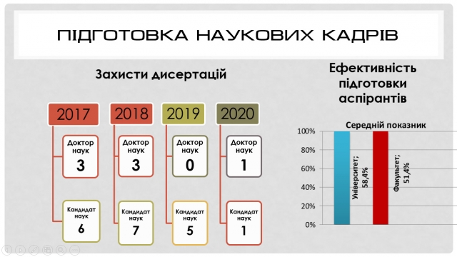 В аспірантурі навчається 34 аспіранти. Цього року збільшилося до шести кількість аспірантів, що навчаються на контрактній основі. Середній показник ефективності підготовки аспірантів по факультету 53,8 %.