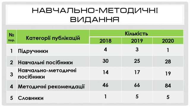Одним з основних напрямів діяльності нашого факультету є навчально-методична робота. Підготовлено і видано у звітному році 1 підручник, 28 навчальних посібників, 19 навчально-методичних посібників, 84 методичних рекомендацій, 5 словників, 3 довідники.