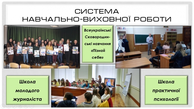 Цьогоріч у зв’язку з пандемією профорієнтаційна робота перемістилася в соціальні мережі, проводилася через відеоконференції як осінньо-весняна школа для абітурієнтів «Юний філолог», «Юний журналіст», «Школа практичного психолога» і Сковородинські читання, що успішно функціонують на факультеті вже багато років, та через особисті контакти.
