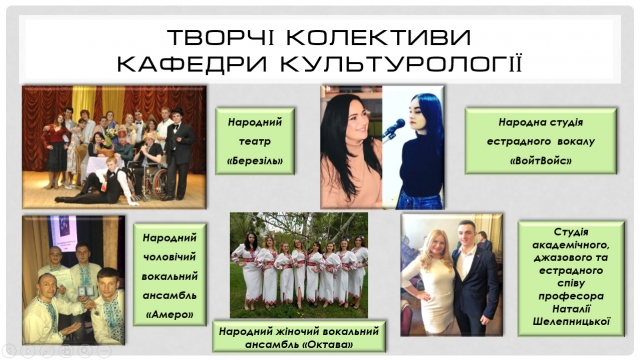 Приємно відзначити, що творчі колективи кафедри культурології звітного року підтвердили або отримала звання народного. Це ‒ народний театр «Березіль», народна студія естрадного вокалу «ВойтВойс», народний чоловічий вокальний ансамбль «Амеро», народний жіночий вокальний ансамбль «Октава».