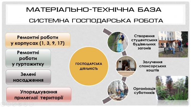 Важливим аспектом забезпечення якості навчального процесу є матеріально-технічна база. Триває дооблаштування медіалабораторії кафедри журналістики та мовної комунікації. Розпочато роботи з облаштування в третьому навчальному корпусі «Лабораторії синхронного перекладу» і «Центру соціально-психологічної реабілітації».