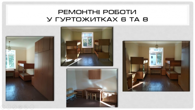 Проведено й серйозні ремонтні роботи в гуртожитках, зокрема за спонсорські кошти та кошти зі спецфонду факультету відремонтовано 24 кімнати, в гуртожитку № 8 облаштовано місця загального користування, капітально відремонтовано коридор і сходовий марш на четвертому поверсі.