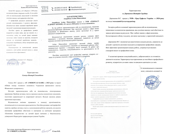 Здобувачі вищої освіти ОП «Економіка підприємства» ОС Магістр заочної форми навчання мають місце роботи за фахом та досвід практичної діяльності у відповідній сфері. Зокрема, Андрійчук А. працює в ТОВ «ТІММАСТЕР» на посаді економіста, Самчук В. працює в АТ "Універсал Банк" на посаді головного економіста управління фінансового аналізу, Опенько М. працює у ФОП Чупиря О.М. на посаді керуючого магазину, Дорошенко В. працює в ТОВ «Кроу Ерфольг Україна» на посаді молодшого бухгалтера-ревізора. Це дозволило їм виконувати індивідуальні практичні завдання за місцем роботи.
