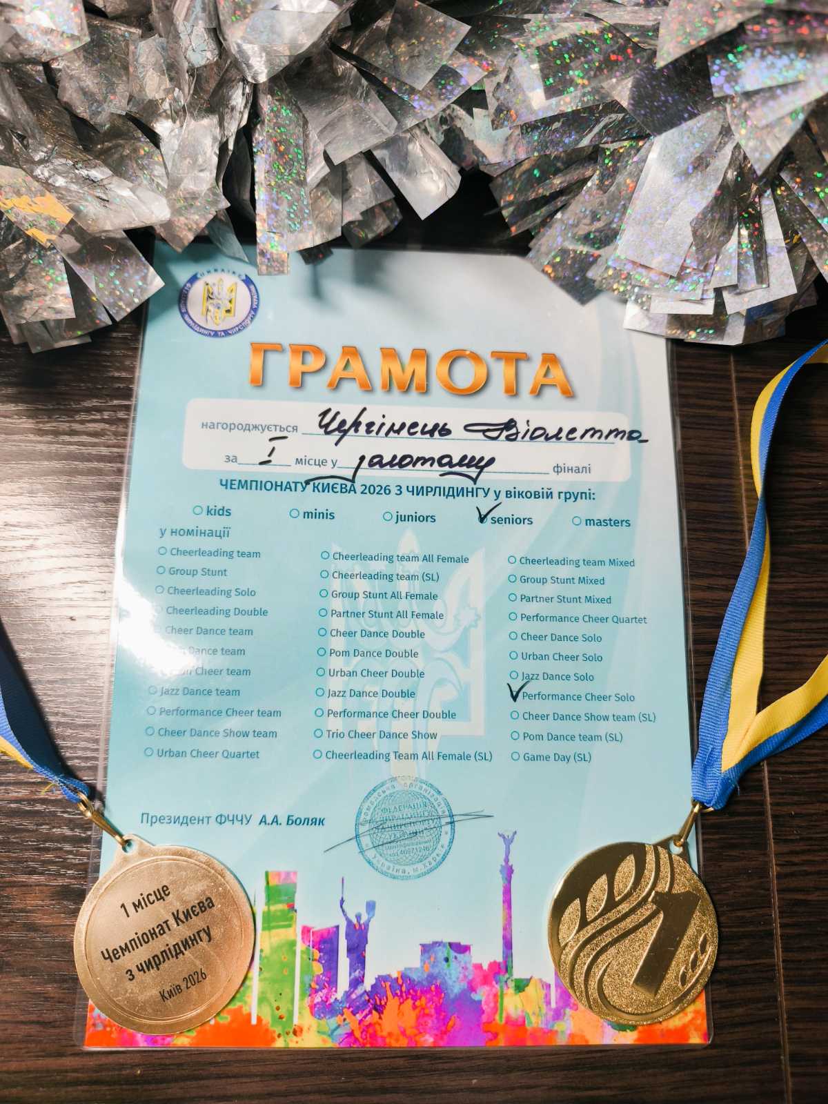 Здобувачка вищої освіти спеціальності «Філологія» Віолетта ЧЕРГІНЕЦЬ здобула яскраву сольну перемогу на чемпіонаті Києва з чирлідингу 2026