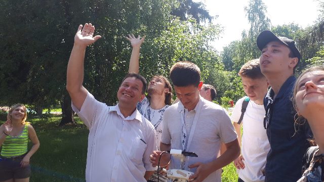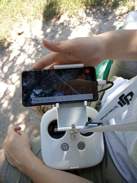 Студенти також мали можливість спостерігати за роботою квадрокоптера DJI Matrice 100, що стало можливим завдяки співпраці із деканатом факультету землевпорядкування. Зйомку частини території навчального полігону в екстремальних спекотних умовах провів ст. викл. кафедри геодезії та картографії, к.е.н. Шевченко О.В.