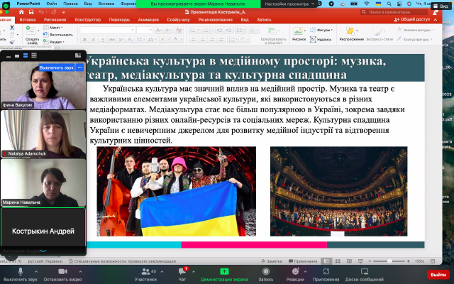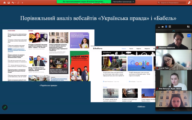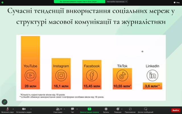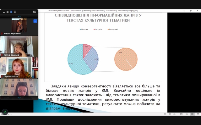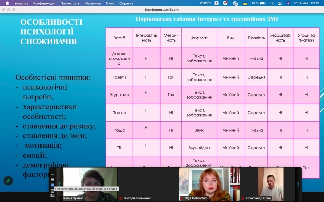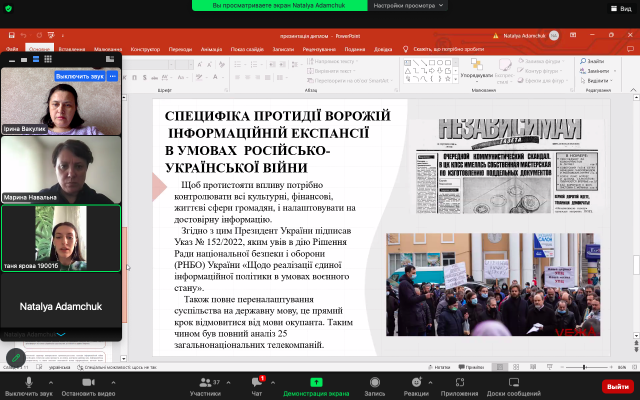 Актуальною була доповідь кандидата наук із соціальних комунікацій, доцента кафедри журналістики та реклами Державного торговельно-економічного університету Оксани Голік «Уподобання аудиторії українських телеканалів в умовах військового стану», оскільки до питання розширення впливів українських телеканалів на свою аудиторію в умовах війни нам доводиться весь час звертатись.