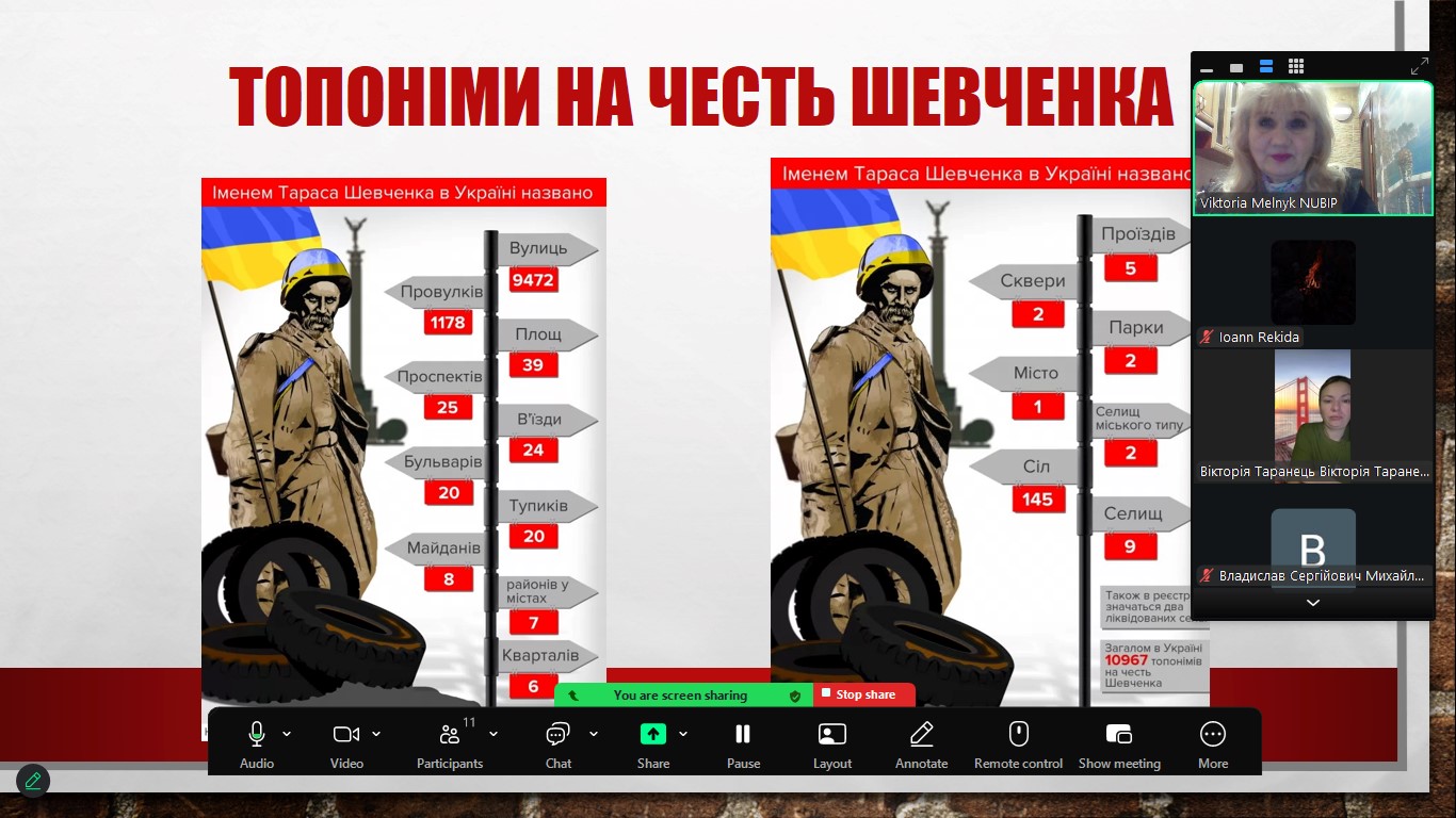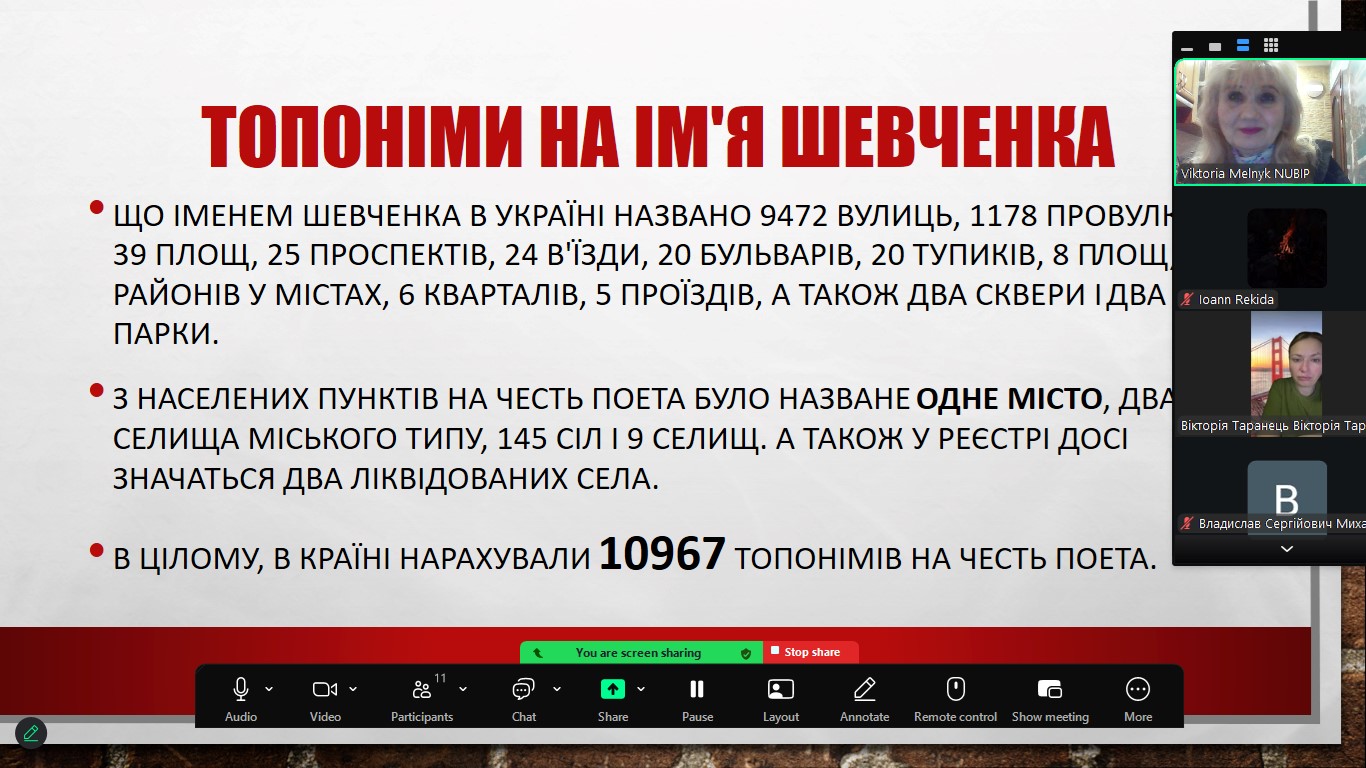 Окрему частину зустрічі було присвячено топонімам на честь Тараса Шевченка, які в Україні є одними з найпоширеніших, адже ім’я Кобзаря стало символом національної ідентичності. Його ім’ям названо міста, села, вулиці, площі, навчальні заклади, театри та природні об’єкти.