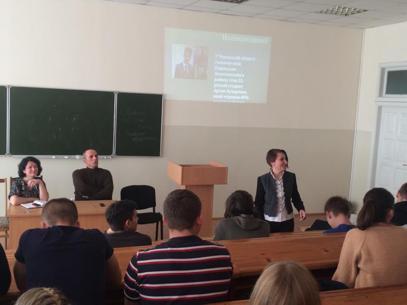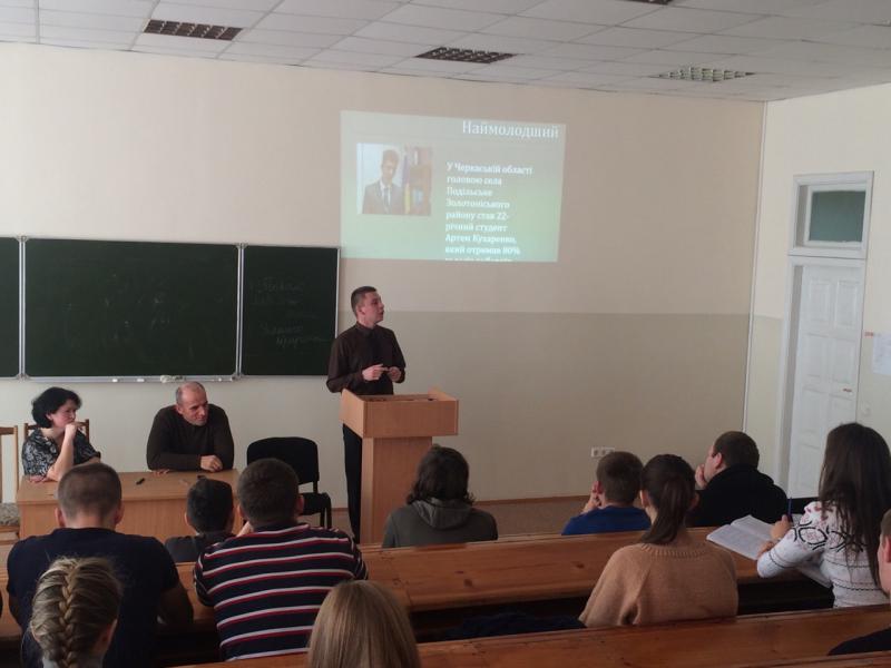 Подивовані студенти були й прикладом наймолодшого сільського голови України – двадцятидвохрічного Артема Кухаренка. Юнак, який навчається в магістратурі, зміг здобути підтримку 80% виборців. Він проявив ініціативу, сміливість, застосував власні творчі здібності – і переміг.