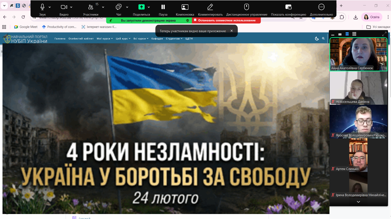 До річниці повномасштабного вторгнення російської федерації в Україну куратори академічних груп спеціальності 101«Екологія» доценти кафедри екології агросфери та екологічного контролю — Сербенюк Анна та Паламарчук Світлана — провели зустріч зі студентами 3 та 4 курсів.