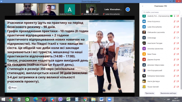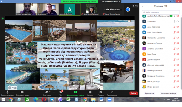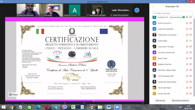 У рамках підписаної Двосторонньої угоди про партнерство щодо організації міжнародної практики між НУБіП України та Асоціацією UCM Italy 06 травня 2022 року була проведена зустріч менеджерів UCM Italy Олександра Ковбаси та Анатолія Полосіна зі студентами, які навчаються за спеціальностями «Готельно-ресторанна справа» та «Туризм».