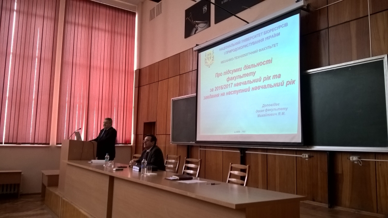 Головною темою доповіді Ярослава Миколайовича стала профорієнтаційна робота на факультеті. Вказано на те, що на підготовчому відділенні по напрямах «Агроінженерія» та «Транспортні технології» займається недостатня кількість абітурієнтів. Співдоповідачем декана виступив заступник декана з наукової роботи доц. Роговський І.Л. Він розповів про наукові здобутки механіко-технологічного факультету та освітлив основні завдання, які покращать якість наукової роботи.