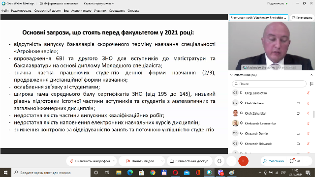 У змістовному виступі ректор університету Станіслав Ніколаєнко окреслив стратегічні завдання, що стоять перед колективом факультету у 2021 році та закликав інтенсифікувати зусилля всіх кафедр та співробітників факультету для їх виконання. Основну увагу у виступі Станіслава Миколайовича було приділено питанням підсилення профорієнтаційної роботи, створення мережі опорних шкіл, активного залучення зовнішнього фінансування на виконання наукових досліджень та надання науково-технічних послуг, посиленню тісної співпраці з провідними роботодавцями, забезпечення осучаснення змісту дисциплін, підвищення якості дистанційного навчання, зокрема, наповнення електронних навчальних курсів. Було наголошено на незмінності позиції керівництва Університету щодо допомоги та сприяння в оновленні матеріально-технічної бази кафедр факультету. Відповіддю на це має стати щоденна кропітка та рівнонапружена робота кожного співробітника факультету.