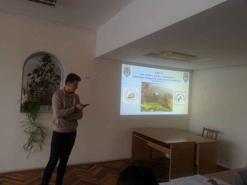 Анатолій прозвітував про діяльність наукового гуртка «Агротурист» за 2018–2019 н.р.Науковий гурток функціонує під керівництвом доцента кафедри аграрного консалтингу і туризму, к.с.г.н., доцента Олени Локутової.Про результати діяльності гуртка "Travelling" звітувала староста гуртка, студент 2 курсу спеціальності «Туризм» Артем Любченко.