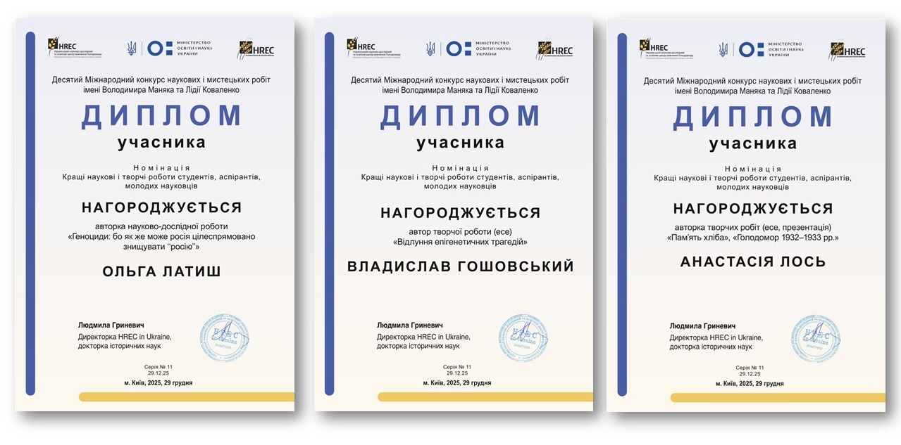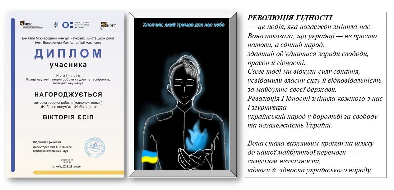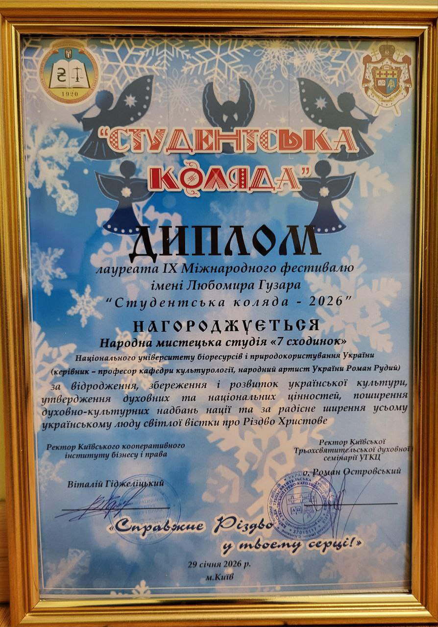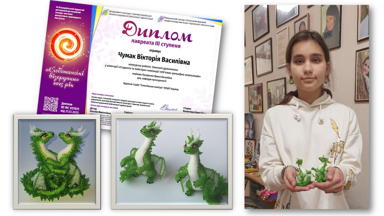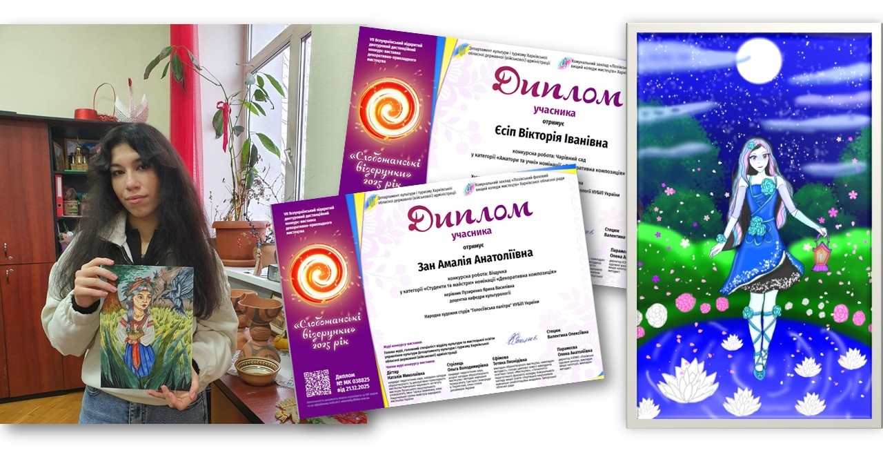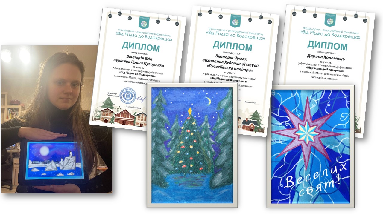 А от мистецька студія «Голосіївська палітра», яка вже має звання «народна», під керівництвом доцентки Ярини ПУЗИРЕНКО, поповнила арсенал нагород на фольклорно-етнографічному фестивалі «Від Різдва до Водохреща», конкурсі «Слобожанські візерунки» 10-му міжнародному конкурсі наукових і мистецьких робіт імені Володимира МАНЯКА і Лідії КОВАЛЕНКО.