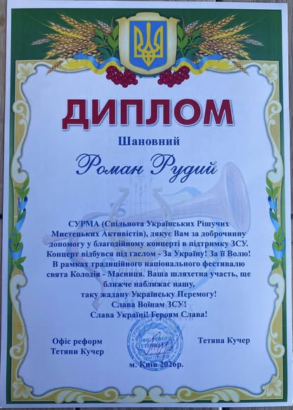 І керівник студії — народний артист України професор кафедри культурології Роман РУДИЙ — теж отримав відзнаку: патріотичний курінь «СУРМА» (Спільнота Українських Рішучих Мистецьких Активістів) у рамках Всеукраїнського фестивалю фольклору «Місто майстрів» нагородив його особливим дипломом.