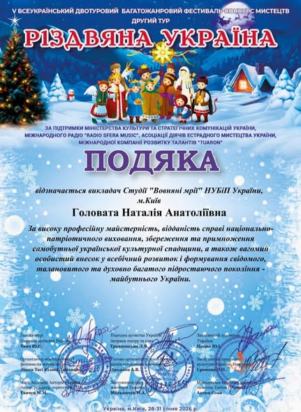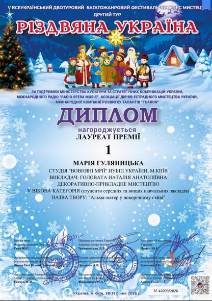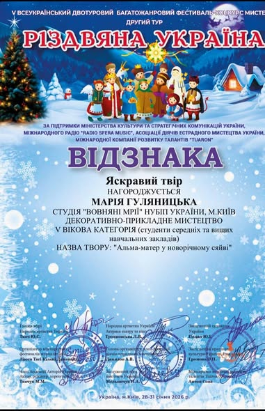 Студія «Вовняні мрії» під керівництвом викладача Наталії ГОЛОВАТОЇ наймолодша на кафедрі, проте успіхи її учасниць — блискучі! Особливої уваги заслуговує Марія ГУЛЯНИЦЬКА, яка почала навчатися у студії, як то кажуть, «з нуля», а нещодавно отримала блискучу перемогу на V Всеукраїнському двотуровому фестивалі-конкурсі мистецтв «Різдвяна Україна»! Її робота, виконана у неймовірно ніжній та складній техніці — малюнок вовною, вразила журі своєю глибиною та майстерністю. Це не просто картина, це втілення тепла, терпіння та справжнього таланту.