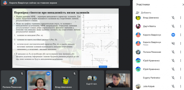Під час активного обговорення було визначено особливості застосування регресійних моделей для моделювання соціально-економічних процесів різної природи, зокрема, проблеми мультиколінеарності та гетерокседаксичності.