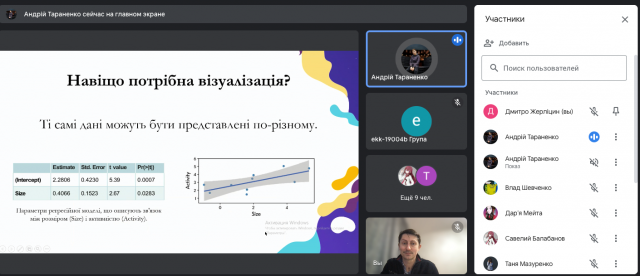 Перша доповідь, що представили студенти Поліна Ремінна та Андрій Тараненко, була присвячена мові програмування R як інструменту статистичного аналізу та візуалізації даних.