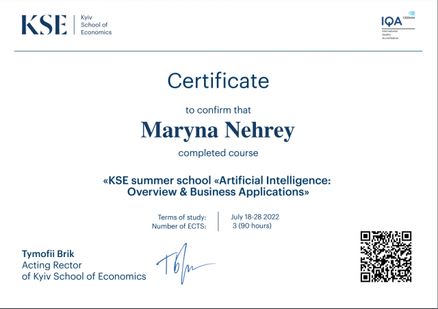 Під час літніх канікул доцент кафедри економічної кібернетики Негрей Марина взяла участь у SUMMER SCHOOL "ARTIFICIAL INTELLIGENCE: OVERVIEW & BUSINESS APPLICATIONS” , що проходила з 18 по 28 липня 2022 року.