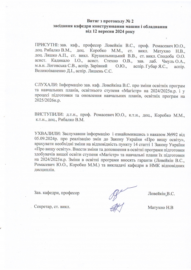 Витяг з протоколу засідання кафедри №2 від 12.09.2024 р.