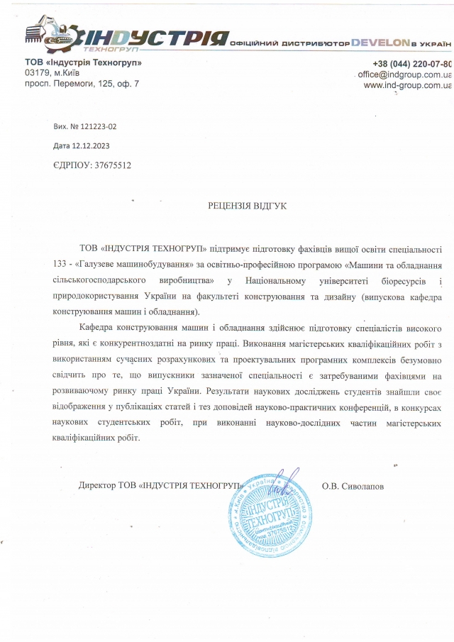 Договір з ТОВ "ІНДУСТРІЯ ТЕХНОГРУП"