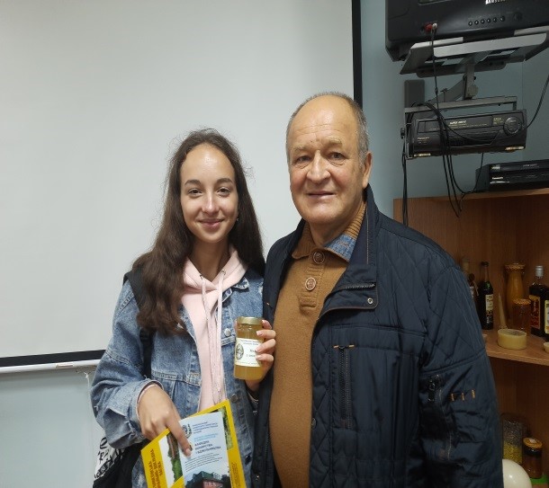 Для першокурсників він провів пізнавальний майстер клас. В ігровій формі, використовуючи українську поезію, історію та різноманітні методи навчання, продемонструвавши найвищий, витончений рівень педагогічної майстерності, Микола Гаврилович надав унікальну інформацію про сучасні методи розвитку бджільництва. Миколі Гавриловичу вдалося настільки зацікавити студентів, що не зважаючи на дощ, вони були у захваті! В кінці майстер класу визначили переможця – найактивнішу студентку, яка надала найбільшу кількість правильних відповідей – заступницю старости, Аліну Метелицю. Аліна отримала приз від завідувача – мед з акації.