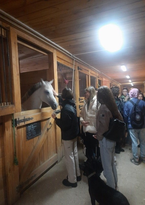 Анжеліка, директор стайні, зустріла першокурсників, розповіла про її мешканців, про характер і поведінку тварин, породи коней, спосіб їх утримання та годівлю, а також високий рівень підготовки, адже вони постійно отримують призові місця у кінних забігах.