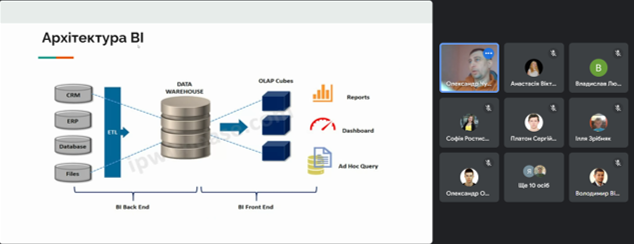 Доповідач зазначив, що Apache NiFi - це потужний відкритий програмний продукт для автоматизації різноманітних потоків даних. Він призначений для ефективного переміщення, обробки і систематизації великого обсягу даних у реальному часі. NiFi може використовуватися для різноманітних завдань, таких як збір даних з різних джерел, їхнє фільтрування, трансформація, маршрутизація і вивід у різноманітні системи або сховища даних. Було детально проаналізовано загальну архітектуру BI систем.