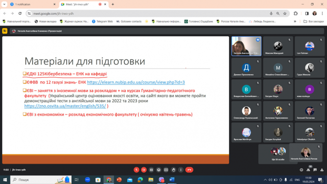 Було надано матеріали для підготовки до здачі ЄВІ та ЄФВВ. Сподіваюсь, зустріч була дуже цікавою, корисною з багатьма питаннями і відповідями. Отже спільними зусиллями випускники нашої кафедри успішно мають завершити бакалаврат, будуть готові до вступу в магістратуру, успішно пройдуть вступні випробування та стануть магістрами з відповідних освітніх програм кафедри.