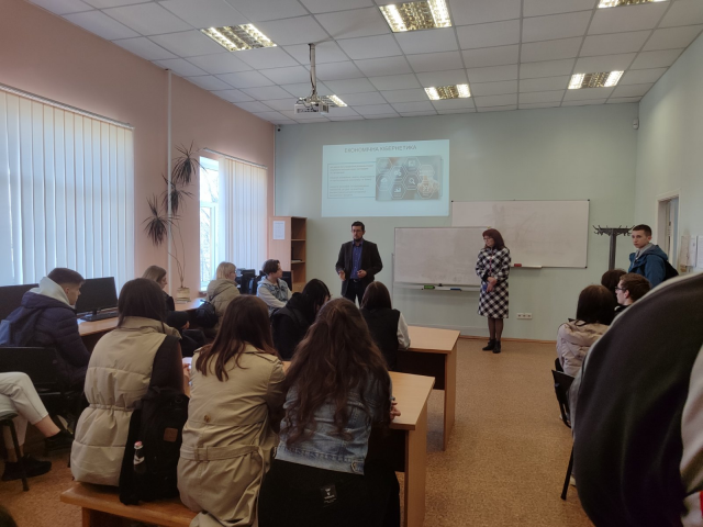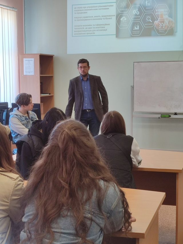 Завідувач кафедри економічної кібернетики Володимир Харченко розповів про особливості навчання на спеціальності 051 «Економіка» та переваги освітньої програми «Економічна кібернетика». Він зазначив, що студенти цієї спеціальності вивчають широкий спектр дисциплін, окреслив план навчання та переваги спеціальності.