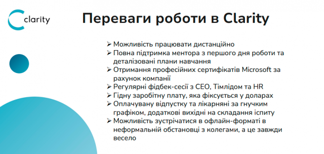 Лекція також містила інформацію про актуальні вакансії у компанії Clarity Ukraine та рекомендації для м’якої адаптації на першому робочому місці. Студенти отримали можливість задати питання та отримати відповіді від професіонала, що допомогло розширити їхнє розуміння реалій ринку праці.