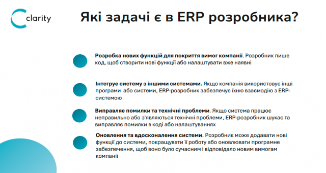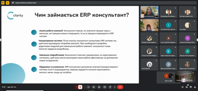 Так, 24 жовтня 2024 р. студенти факультету інформаційних технологій освітніх програм «Економічна кібернетика», «Цифрова економіка» та «Інформаційні системи і технології» мали можливість взяти участь у гостьовій лекції, яку провела Василина Пахомова, досвідчена ERP консультантка та тім-лід команди міжнародної компанії Clarity Ukraine.