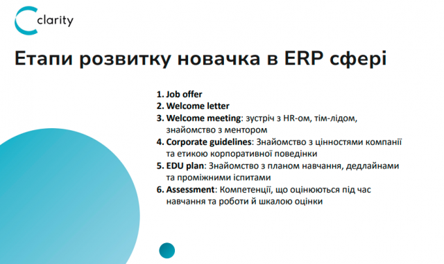 Лектор наголосив на основних етапах розвитку новачка в ERP сфері, які включають отримання пропозиції роботи, ознайомлення з корпоративними цінностями, навчальний план і оцінювання компетенцій. Ці етапи допомагають новачкам адаптуватися та успішно розвиватися в компанії.