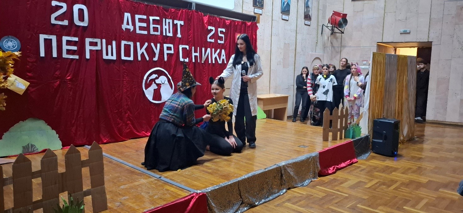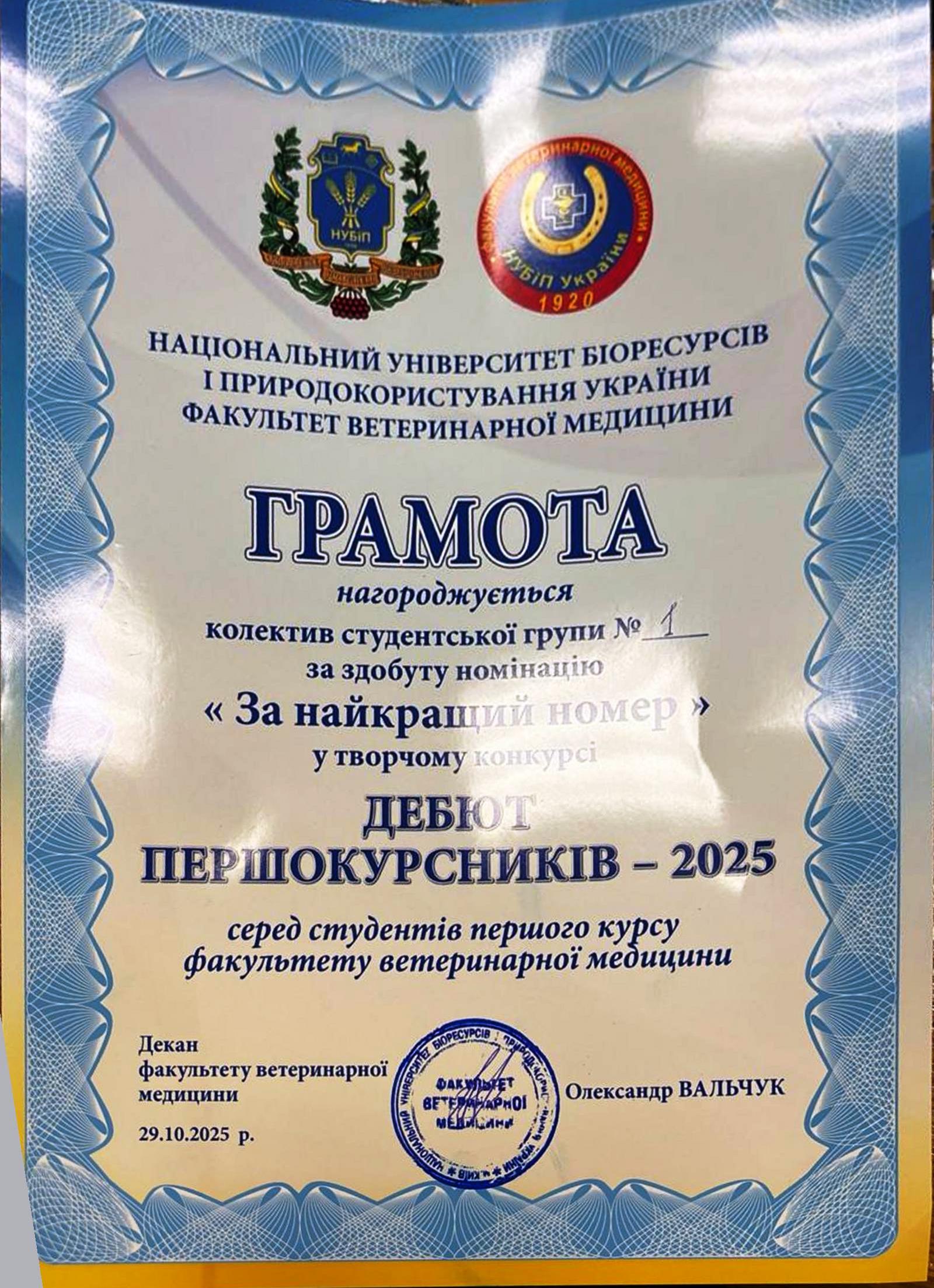 Традиційне свято «Дебют першокурсника» на факультеті ветеринарної медицини НУБіП України стало яскравою подією для студентів і викладачів. Цьогоріч першокурсники 1 групи представили глядачам оригінальну театралізовану постановку, у якій поєднали гумор, фольклор і професійну тематику. Постійний творчий запал і дружню підтримку учасникам надавали студентський куратор Дана Трач і куратор групи Вадим Іщенко.