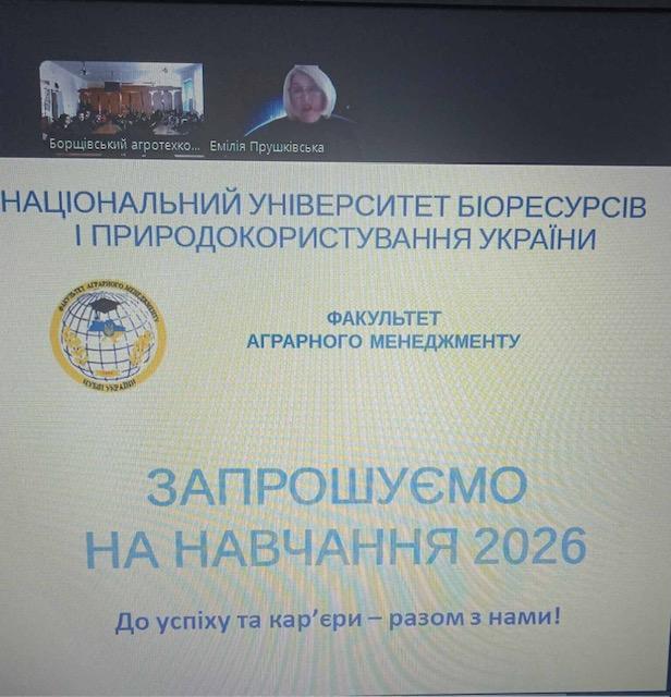 У фаховому Борщівському агротехнічному коледжі 03 листопада 2025 року відбулася зустріч зі студентами випускних курсів на тему «Побудуй кар’єру в аграрному менеджменті: профорієнтаційний захід НУБіП». Молодь, яка вже володіє початковими професійними компетентностями в аграрній галузі, проф. Емілія ПРУШКІВСЬКА ознайомила з перспективами бакалаврського навчання та подальшого кар’єрного розвитку. Емілія Василівна підкреслила, що сучасний аграрний сектор потребує не лише кваліфікованих виконавців, а й фахівців управлінського рівня, здатних застосовувати інновації, цифрові технології та бізнес-інструменти.