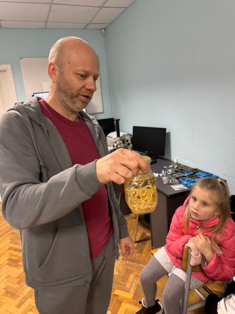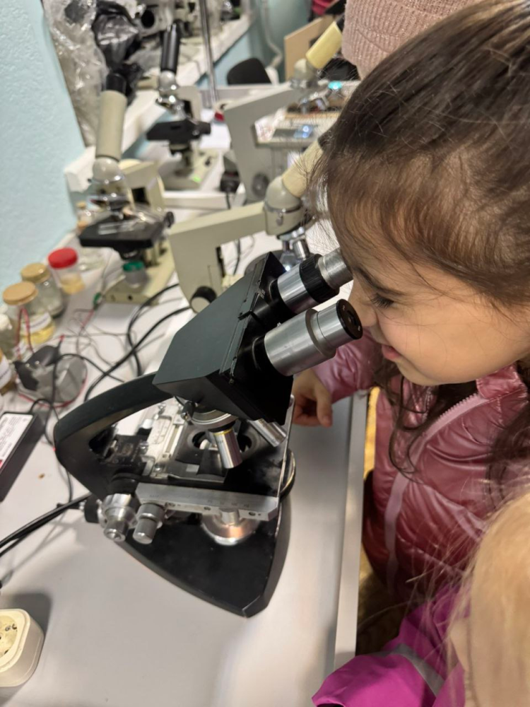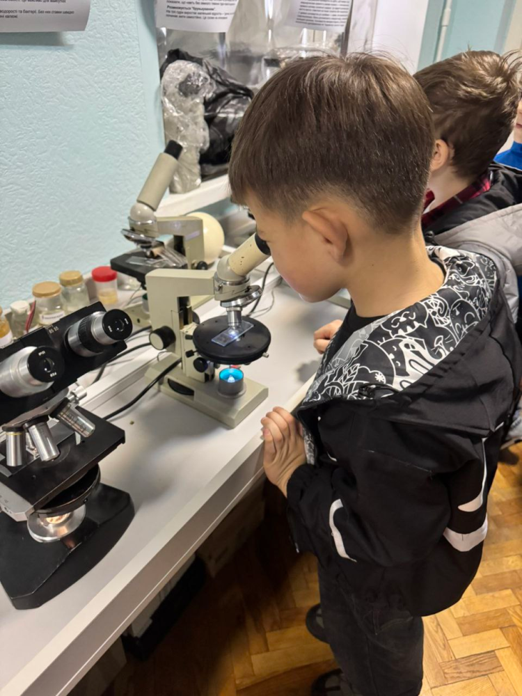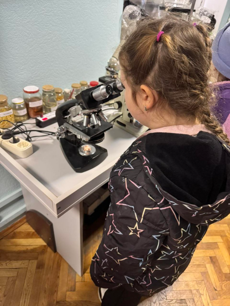 Наступною зупинкою стала аудиторія з мікроскопами. Тут діти мали можливість зазирнути у мікросвіт, який не видно неозброєним оком, й побачити інфузорій, гідр, дафній, комах, кліщів і навіть гельмінтів.